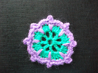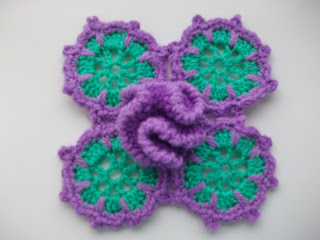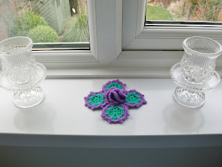 This motif can be quite awkward to make as there are so many increases but it is worth it because it's lovely when it's finished. The picture doesn't do it justice, this little flower can be made as big or as small as you like and can be used for all kinds of things. I have made mine on the small side because I wanted to use it as part of a little centre piece.