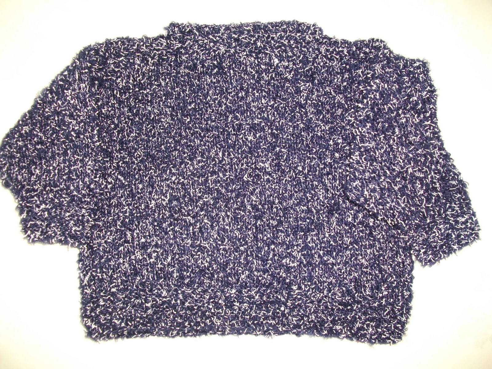I decided that it would make a lovely jumper or jacket for a child so out came my patterns and I started with great enthusiasm, however, attempt after attempt was pulled out, the tension wasn't right, I was getting more and more despondent. the stuff was awful to knit with and because it was a dark shade I couldn't see the stitches either. In sheer desperation I appealed to the ladies on loving hands, one of the ladies suggested I use one of her patterns because they worked with all types of yarn. I did as she suggested and although I had to adapt it quite a bit I finally managed to make a little sweater. It's lovely and soft and I hope it will keep some little child warm.
