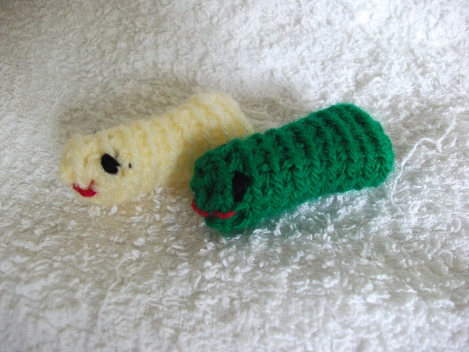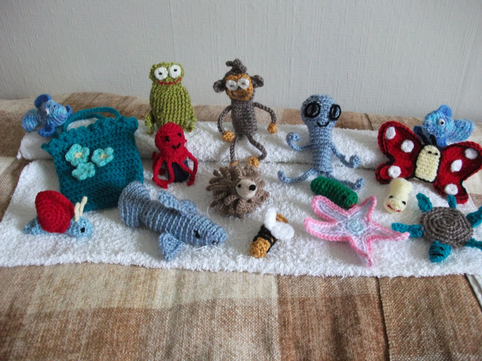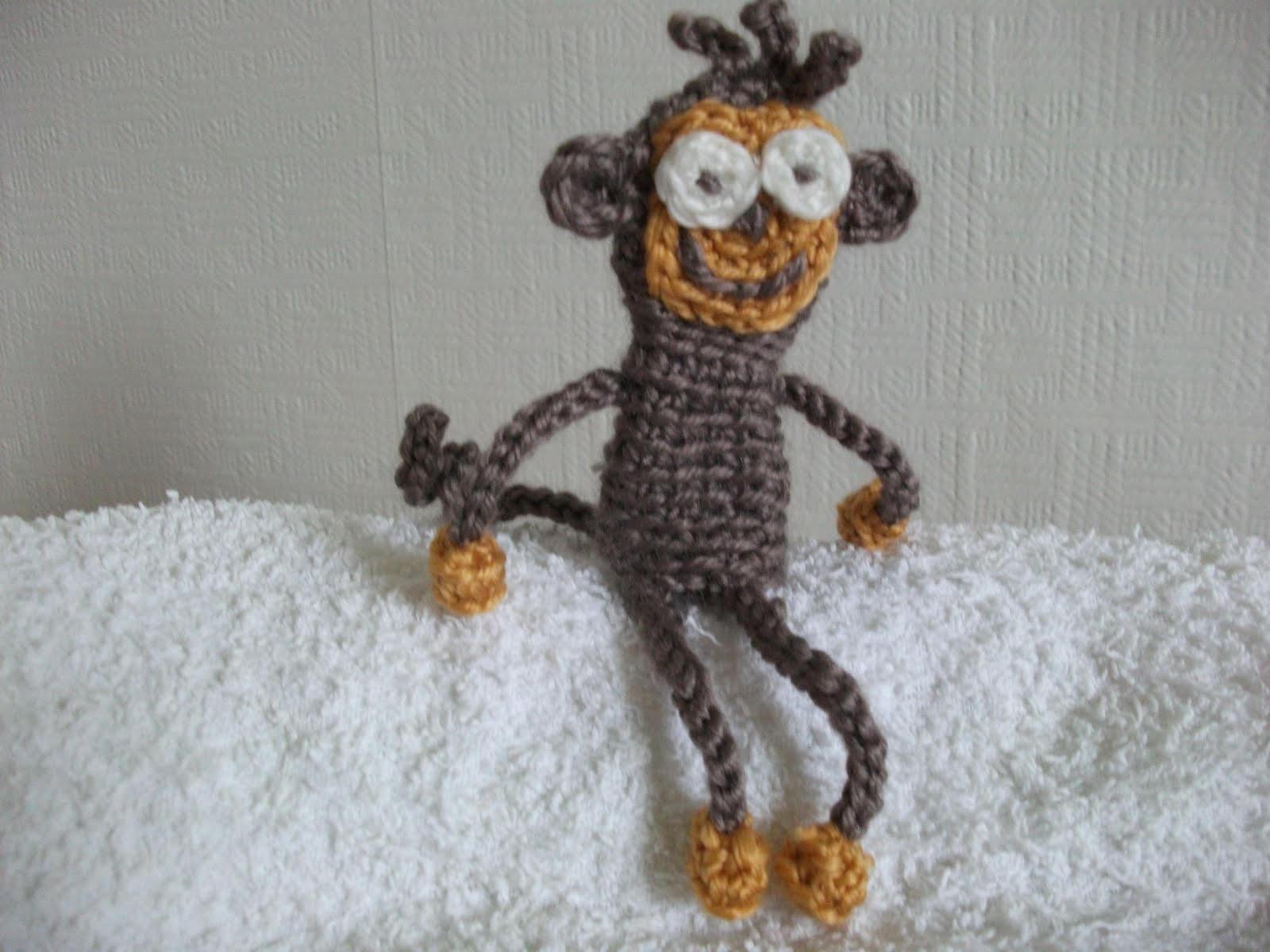 I have to say these little puppets do take ages to do, the monkey in particular consists of fourteen pieces!  I'm wondering which puppets my friend is going to take for her boys.  I am off to tackle a spider.  More to come later. Patterns can be found in Gina Alton's book Crochet Finger Puppets .