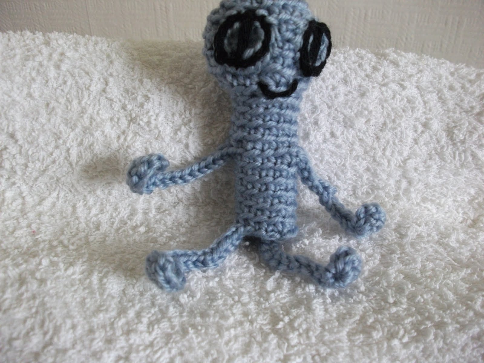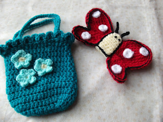 I don't usually get presents for Easter apart from the odd Easter Egg of course but this year my friend K gave me some  chocolate goodies and..... a crochet book, he knows me so well, he knew I would love this. I looked through the book at the time but have only just began to explore the possibilities inside. Finger puppeting has it's moments but the moments tend to stretch out to longer periods of time I have found.  Unless you try it you can not know just how much work goes into the making of these tiny little gems.  Some are pretty straight forward and others seem to go on forever.  My first attempt was this lovely little bag and butterfly.
