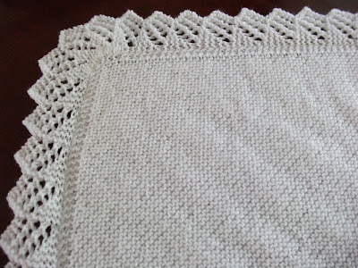 One of the projects I have finished is a Sands Blanket. These are given to bereaved parents who have just lost a newborn. These blankets are lovely to make because it's just simple garter stitch knitted from corner to corner making a square, so you can watch TV and knit without even thinking about it. Then a beautiful lacy border to finish it off. I must admit doing the border is a bit monotonous, but it is worth it as it finishes the blanket off beautifully.